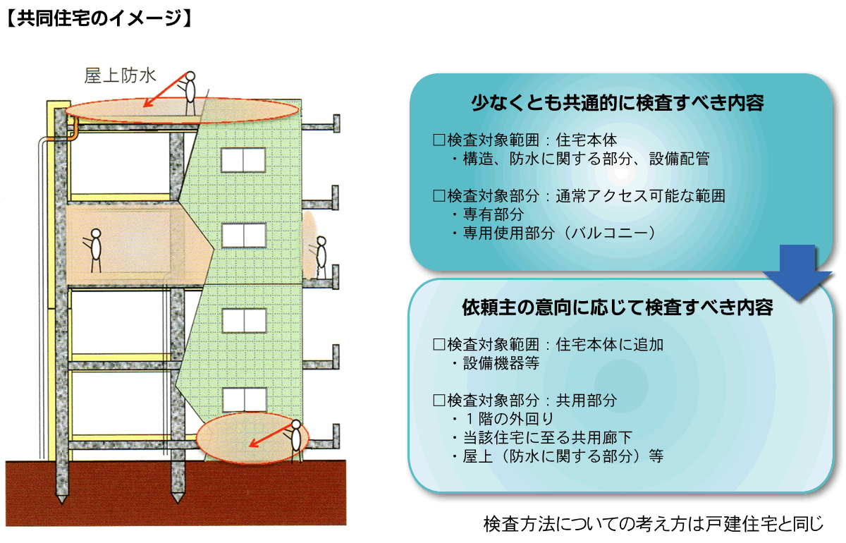 共同住宅の検査対象は、専有部分および専用使用しているバルコニーから目視可能な範囲です。
